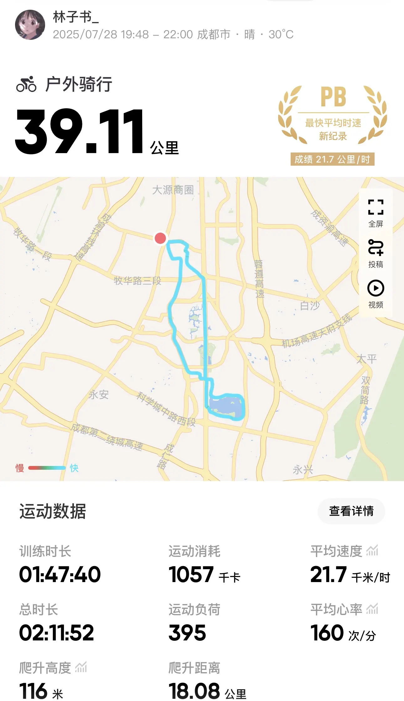 作者分享了傍晚骑行的体验。他欣赏到了美丽的晚霞,并且很高兴自己的平均骑行速度再次打破纪录,一度达到22公里/小时。然而,在快到家门口时,连续遇到三个红绿灯,导致速度被拉低,令他感到非常懊恼和遗憾。