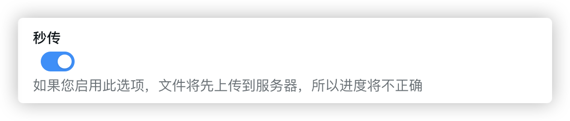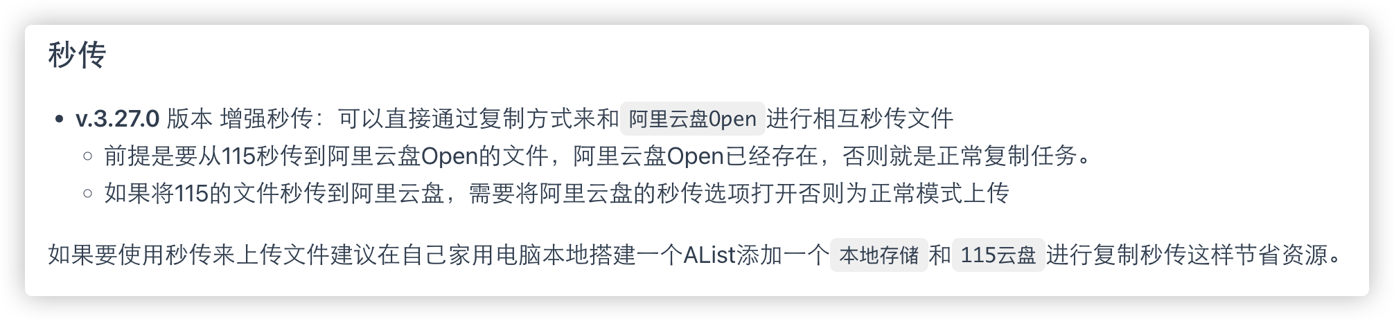 阿里盘是支持直接秒传到115,需要注意的是记得在挂载的阿里盘选项中把秒传选项打开并保证Alist版本在V3.27.0及以上。