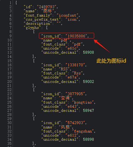 后来在阿里矢量图的项目后台中在线链接里面发现有个json配置文件,里面记录着矢量图标相关信息,只需要在外部调用的js中将请求的js文件改为json即可获得对方的矢量图标配置文件。